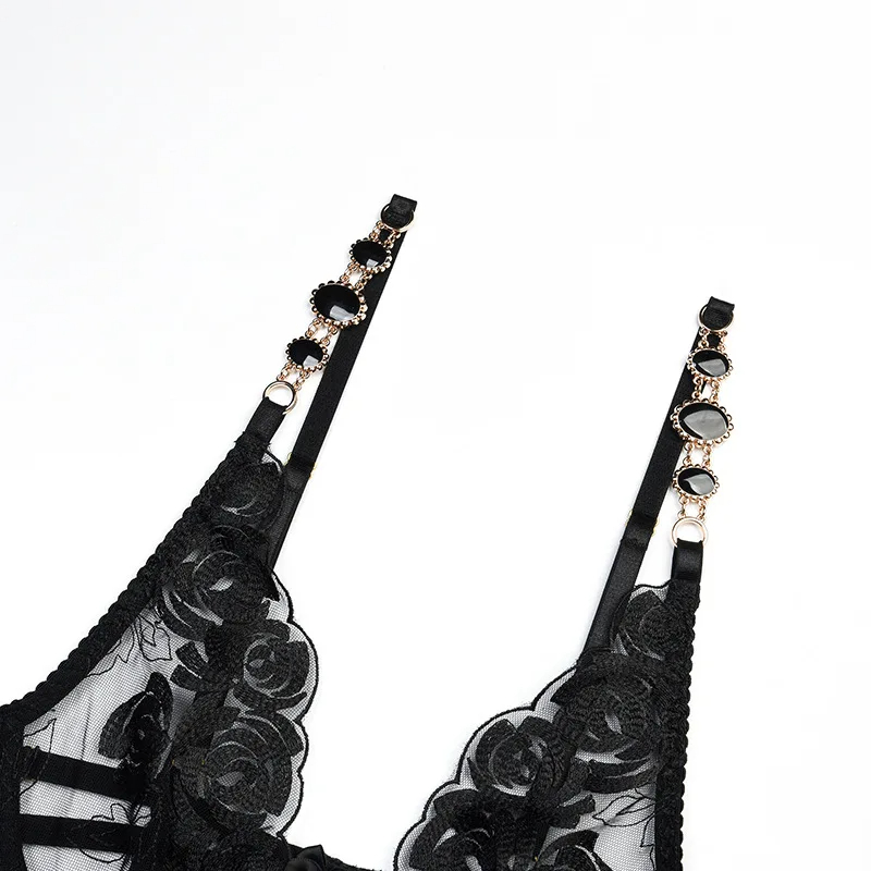 Koronkowa bielizna to symbol kobiecości i klasy. Każdy element został mistrzowsko ozdobiony, aby podkreślić naturalną urodę i sprawić, że każda kobieta będzie wyglądać niezwykle uwodzicielsko. Wykonany z najwyższej jakości materiałów, ze złotymi zdobieniami stanie się tajnym atutem w szafie nawet najbardziej wymagających kobiet.
