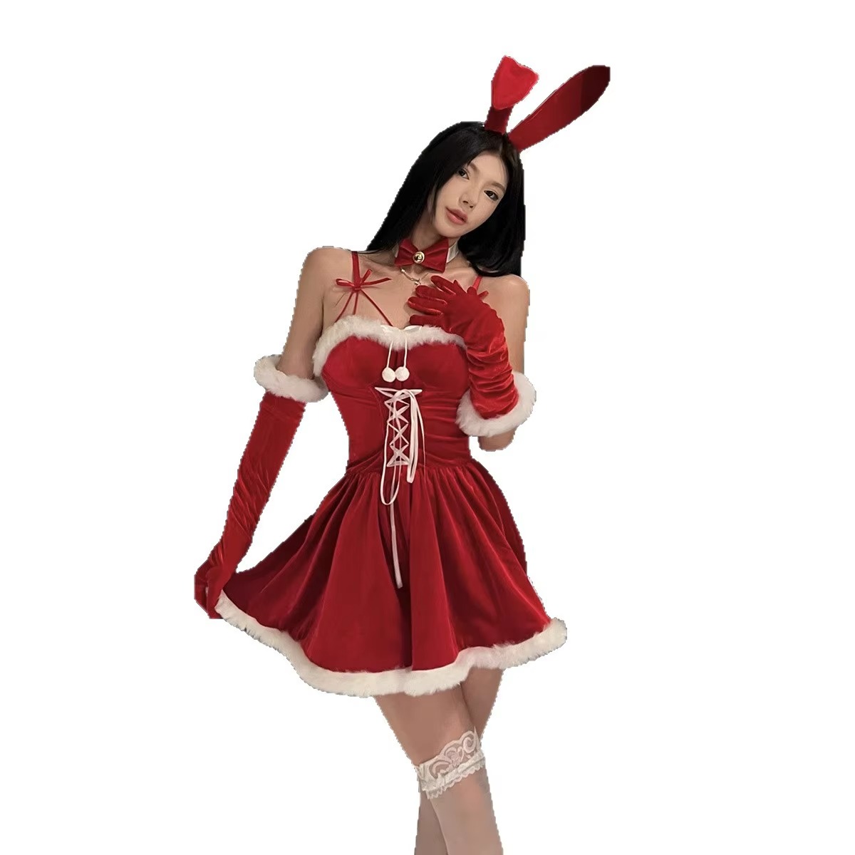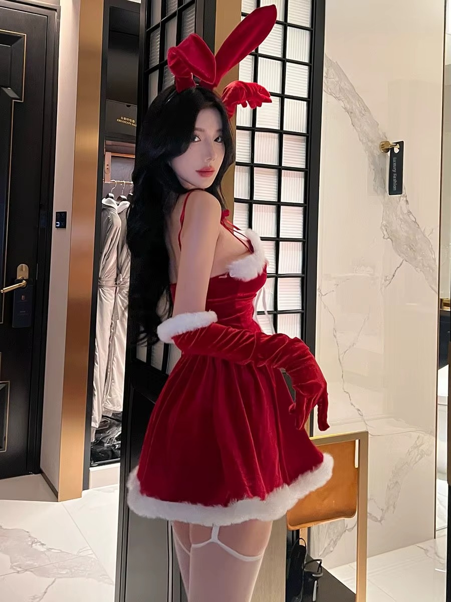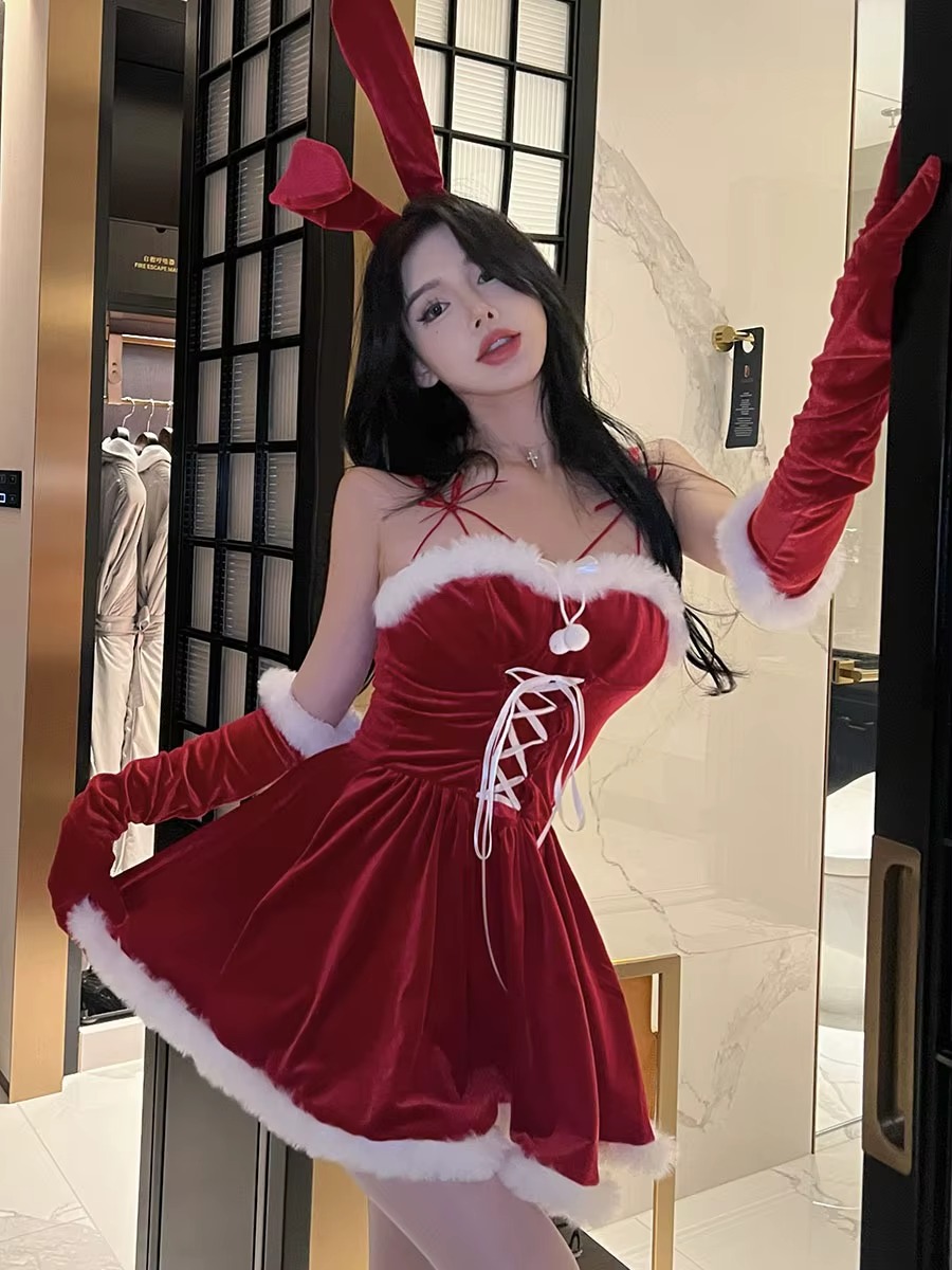Zmysłowy komplet świąteczny w formie uroczej sukienki. Czerwony, miękko układający się materiał pięknie podkreśla talię, a białe futerko na wykończeniach nadaje całości zimowego, kokieteryjnego charakteru. Dekolt ozdobiony krzyżującymi się paseczkami i satynowe wiązanie z przodu subtelnie eksponują biust i modelują sylwetkę. Idealna propozycja na święta, sesje zdjęciowe lub wyjątkowe wieczory, kiedy chcesz połączyć niewinny urok z wyrazistą zmysłowością.