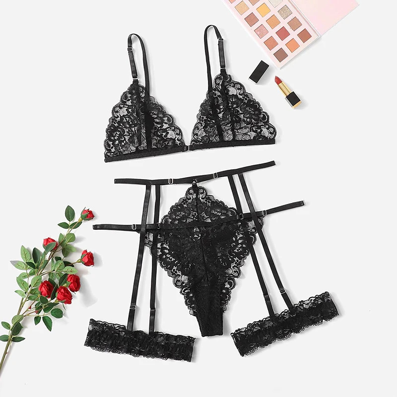 Sensualny komplet bielizny Zoe, w którym poczujesz się kobieco i seksowanie. Koronkowy stanik, majtki i minimalistyczny pas na pończoch doda seksapilu każdej kobiecie.