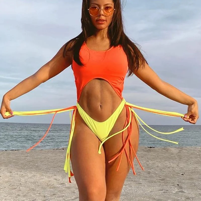 Jednoczęściowy strój kąpielowy z wycięciem Brisa udowadnia, że można mieć wszystko! Wygląd stroju dwuczęściowego i wygodę jednoczęściowego w pięknych kolorach. Ozdobne frędzelki przy biodrach dodają całości niepowtarzalnego charakteru. Majtki pięknie podkreślają nogi optycznie je wydłużając, top pięknie eksponuje biust, zdecydowanie warto mieć taki strój w swojej szafie!