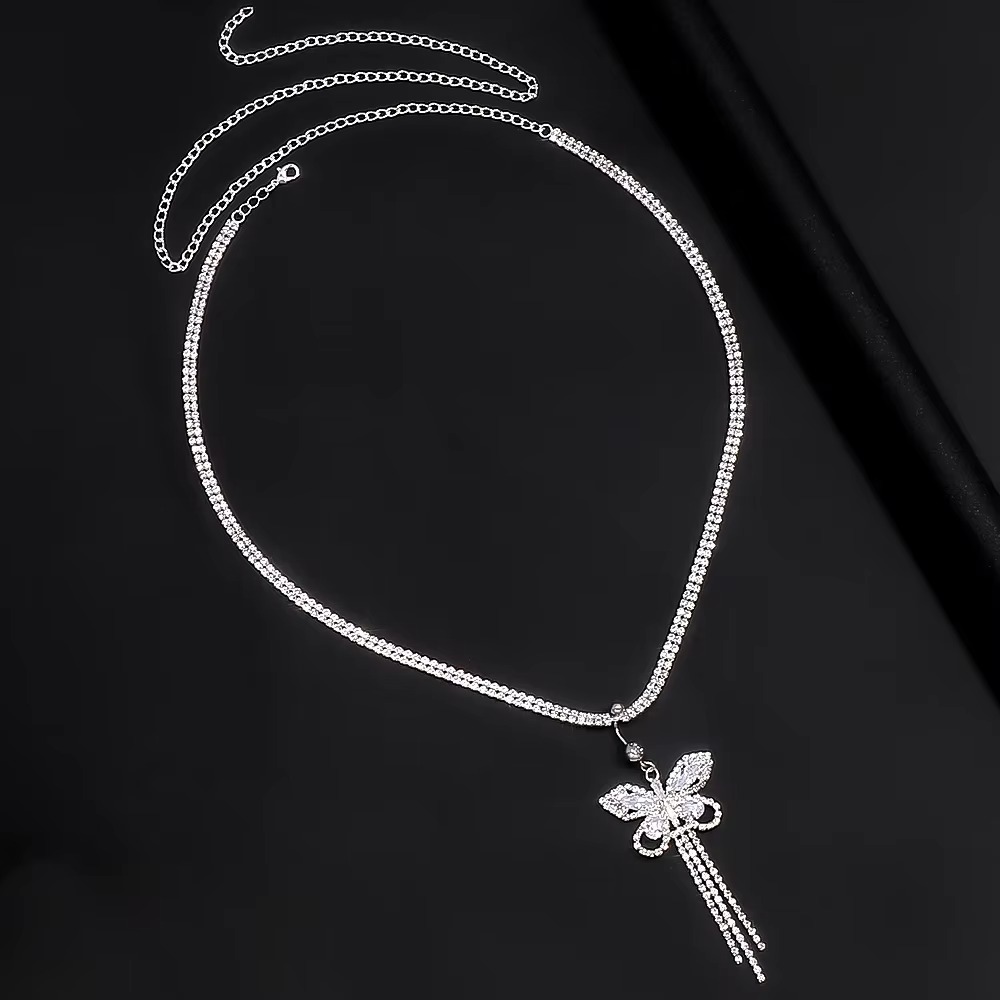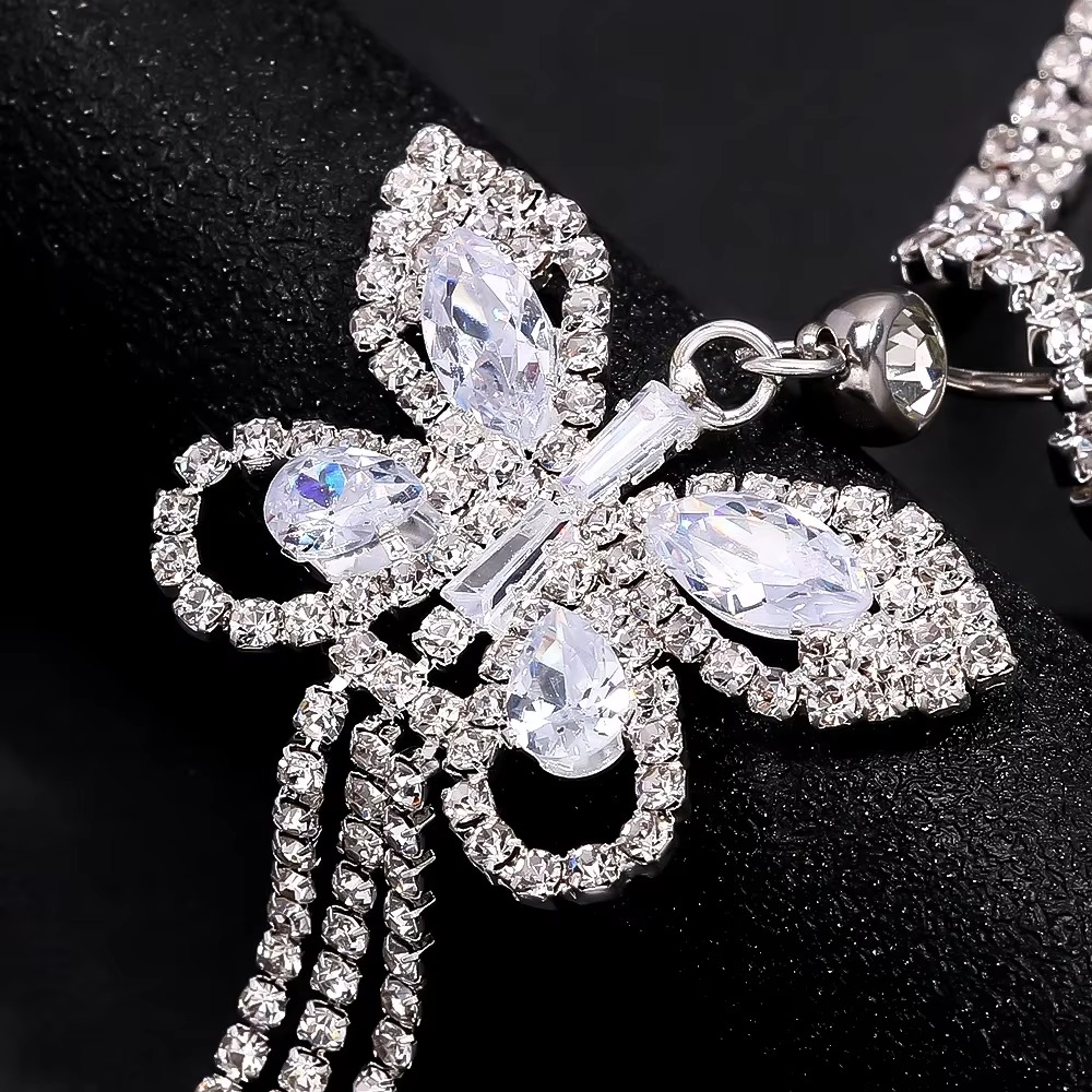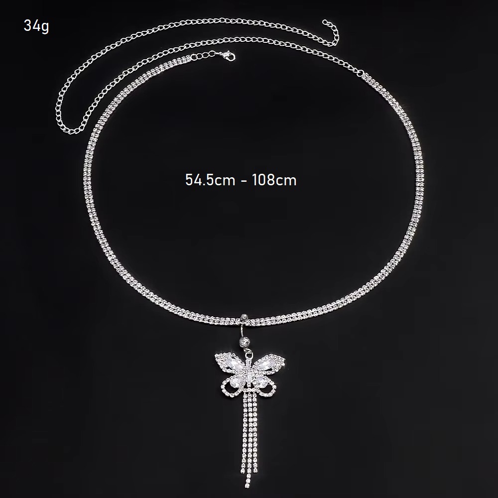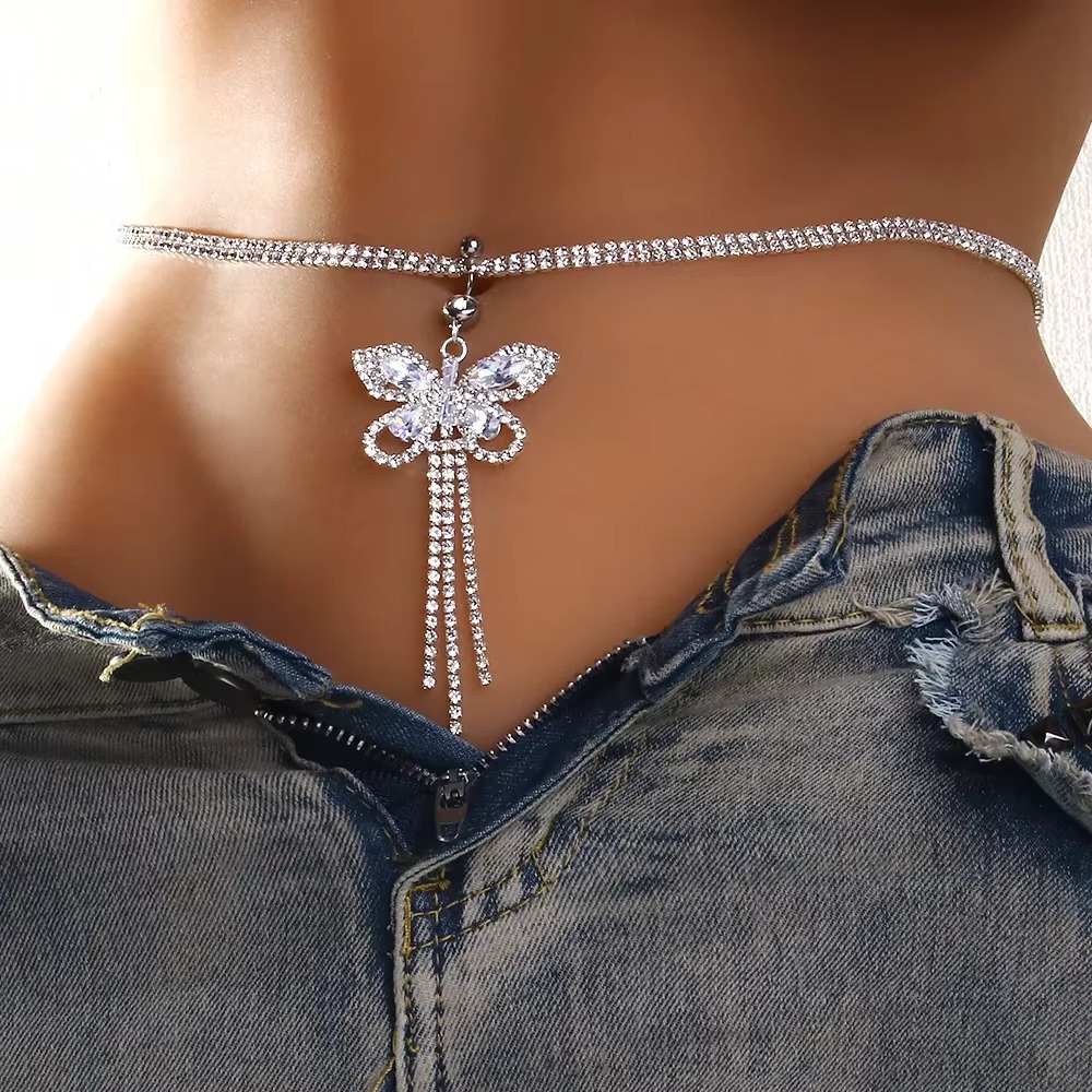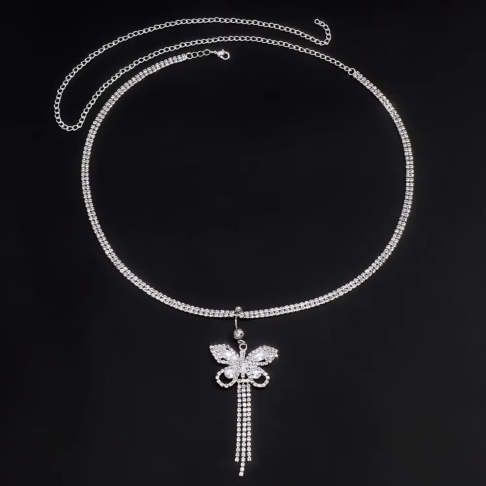 Elegancki łańcuszek na biodra z motywem motyla, ozdobiony błyszczącymi cyrkoniami. Doskonale podkreśla talię i dodaje blasku każdej stylizacji — idealny do sukienek, spodni i letnich zestawów. Regulowana długość zapewnia wygodne dopasowanie.