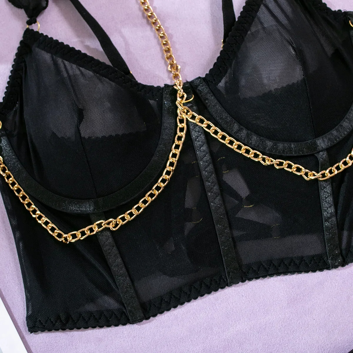Pudrowy, zmysłowy strój księżniczki to idealna propozycja dla kobiet, które cenią sobie delikatność połączoną z odrobiną subtelnego charakteru. Pudrowy odcień nadaje zestawowi romantycznego i dziewczęcego wyglądu, podkreślając każdy atut kobiecej sylwetki. Komplet wyróżnia się starannie zaprojektowanymi detalami, takimi jak kokardki, delikatne łańcuszki i lekkość tiulowych elementów. Zanurz się w bajkowym świecie i poczuj jak prawdziwa księżniczka. W skład zestawu wchodzą gorsetowy biustonosz z chokerem, rękawiczki, spódniczka, majtki oraz pasy na uda.